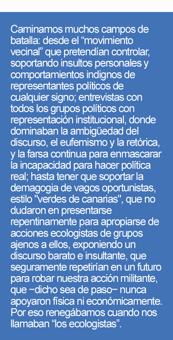 Caminamos muchos campos de batalla: desde el “movimiento vecinal” que pretendían controlar, soportando insultos personales y comportamientos indignos de representantes políticos de cualquier signo; entrevistas con todos los grupos políticos con representación institucional, donde dominaban la ambigüedad del discurso, el eufemismo y la retórica, y la farsa continua para enmascarar la incapacidad para hacer política real; hasta tener que soportar la demagogia de vagos oportunistas, estilo «verdes de canarias», que no dudaron en presentarse repentinamente para apropiarse de acciones ecologistas de grupos ajenos a ellos, exponiendo un discurso barato e insultante, que seguramente repetirían en un futuro para robar nuestra acción militante, que −dicho sea de paso− nunca apoyaron física ni económicamente. Por eso renegábamos cuando nos llamaban “los ecologistas”.