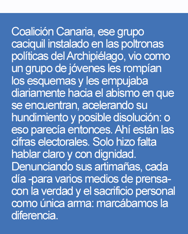 Coalición Canaria, ese grupo caciquil instalado en las poltronas políticas del Archipiélago, vio como un grupo de jóvenes les rompían los esquemas y les empujaba diariamente hacia el abismo en que se encuentran, acelerando su hundimiento y posible disolución: o eso parecía entonces. Ahí están las cifras electorales. Solo hizo falta hablar claro y con dignidad. Denunciando sus artimañas, cada día -para varios medios de prensa- con la verdad y el sacrificio personal como única arma: marcábamos la diferencia.
