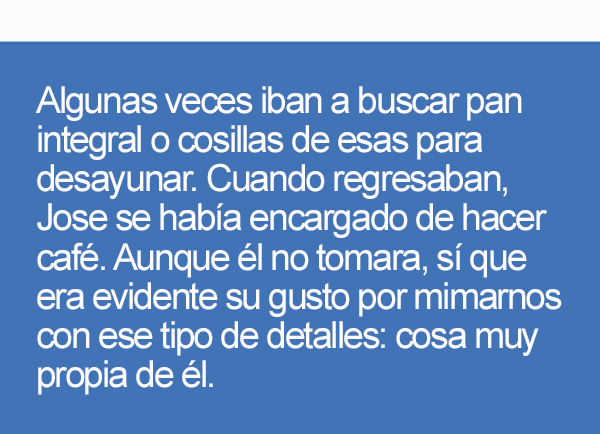 Algunas veces iban a buscar pan integral o cosillas de esas para desayunar. Cuando regresaban, Jose se había encargado de hacer café. Aunque él no tomara, sí que era evidente su gusto por mimarnos con ese tipo de detalles: cosa muy propia de él.