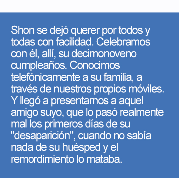 Shon se dejó querer por todos y todas con facilidad. Celebramos con él, allí, su decimonoveno cumpleaños. Conocimos telefónicamente a su familia, a través de nuestros propios móviles. Y llegó a presentarnos a aquel amigo suyo, que lo pasó realmente mal los primeros días de su «desaparición», cuando no sabía nada de su huésped y el remordimiento lo mataba.