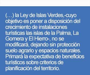7.- Por otra parte, del mismo contenido del programa del Pacto de las Flores se desprende que la Ley de Islas Verdes,-cuyo objetivo es poner a disposición del crecimiento de instalaciones turísticas las islas de la Palma, La Gomera y El Hierro-, no se modificará, dejando sin protección suelo agrario y espacios naturales. Primará la expectativa de beneficios turísticos sobre criterios de planificación del territorio.