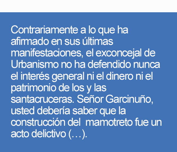 3.- Contrariamente a lo que ha afirmado en sus últimas manifestaciones, el exconcejal de Urbanismo no ha defendido nunca el interés general ni el dinero ni el patrimonio de los y las santacruceras. Señor Garcinuño, usted debería saber que la construcción del mamotreto fue un acto delictivo, como dice la sentencia, y lo primordial en estos casos, según el Código Penal, es la reparación del daño ocasionado por el delito. Algo plenamente dotado de sentido, ya que, de otro modo, la voluntad del infractor prevalecería sobre la de la ley. Así las cosas, la reparación del daño, ahora en la forma de demolición de la construcción ilegal, será, en principio, la regla. Por lo tanto, el inacabado mamotreto nunca puede considerarse como un elemento del patrimonio municipal. Por otro lado, si fuera verdad que defiende el dinero de las y los chicharreros, debería haberse abstenido de gastar dinero público en informes absurdos y extemporáneos, dado que la sentencia es firme y ha adquirido la consideración de cosa juzgada con todo lo que ello significa. Al mismo tiempo, en su afán de mantener el mamotreto a toda costa, ha despilfarrado una ingente cantidad de capital humano al depurar, junto con el alcalde Bermúdez y el concejal Díaz-Estébanez, a unas funcionarias, juristas de contrastado prestigio profesional, porque no avalaban las tesis del grupo de gobierno municipal, a pesar de las amenazas recibidas, y contratando a otras que estuvieran dispuestas a firmar los informes deseados.