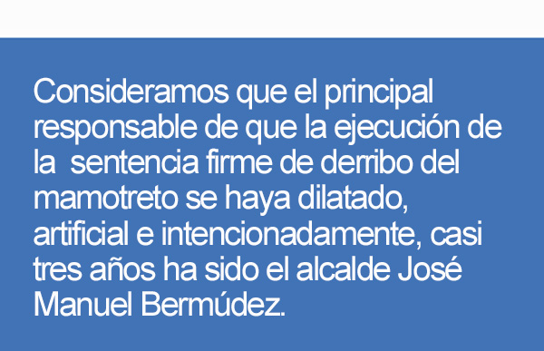 1.- Consideramos que el principal responsable de que la ejecución de la sentencia firme de derribo del mamotreto se haya dilatado, artificial e intencionadamente, casi tres años ha sido el alcalde José Manuel Bermúdez. En innumerables ocasiones nuestra plataforma ha denunciado los actos de sabotaje del alcalde a esa decisión judicial. Bermúdez ha utilizado torticeramente todos los medios de que dispone el ayuntamiento, incluso dinero público, para mantener en pie el adefesio, un edificio ilegal e ilegalizable convertido en monumento a la corrupción, burlando a la Justicia y al pueblo de Santa Cruz, y coqueteando peligrosamente con el delito de prevaricación.