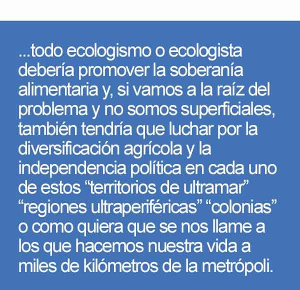 Por lo tanto, todo ecologismo o ecologista debería promover la soberanía alimentaria y, si vamos a la raíz del problema y no somos superficiales, también tendría que luchar por la diversificación agrícola y la independencia política en cada uno de estos “territorios de ultramar” “regiones ultraperiféricas” “colonias” o como quiera que se nos llame a los que hacemos nuestra vida a miles de kilómetros de la metrópoli.