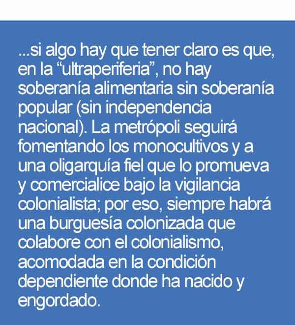 La soberanía alimentaria es una apuesta por los alimentos de “kilómetro cero”; aunque el nuevo concepto que Naciones Unidas ha inventado solo pretenda sustituir al de Soberanía Alimentaria. Sin duda, esto incomoda menos a los países colonialistas que siguen manteniendo territorios de ultramar; para quienes es imposible el ejercicio de autoabastecimiento por la condición de dependencia que crea la metrópoli aposta, para subyugar económicamente a las colonias, donde la entrada de excedentes a precios por debajo de los de coste y pésima calidad mantiene  imposibilitado el crecimiento de una agricultura diversa local. Por eso, si algo hay que tener claro es que, en la “ultraperiferia”, no hay soberanía alimentaria sin soberanía popular (sin independencia nacional). La metrópoli seguirá fomentando los monocultivos y a una oligarquía fiel que lo promueva y comercialice bajo la vigilancia colonialista; por eso, siempre habrá una burguesía colonizada que colabore con el colonialismo, acomodada en la condición dependiente donde ha nacido y engordado.