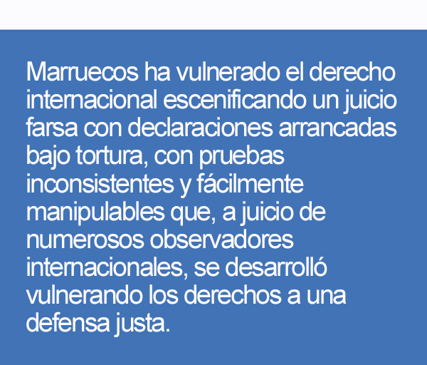 Marruecos ha vulnerado el derecho internacional escenificando un juicio farsa con declaraciones arrancadas bajo tortura, con pruebas inconsistentes y fácilmente manipulables que, a juicio de numerosos observadores internacionales, se desarrolló vulnerando los derechos a una defensa justa.