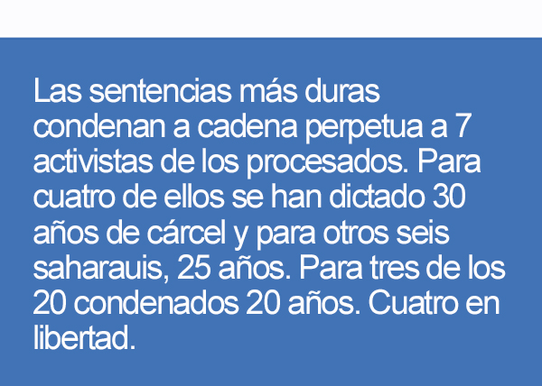 Las sentencias más duras condenan a cadena perpetua a 7 activistas de los procesados. Para cuatro de ellos se han dictado 30 años de cárcel y para otros seis saharauis, 25 años. Para tres de los 20 condenados 20 años. Cuatro en libertad.