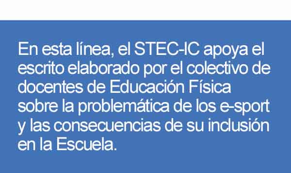 En esta línea, el STEC-IC apoya el escrito elaborado por el colectivo de docentes de Educación Física sobre la problemática de los e-sport y las consecuencias de su inclusión en la Escuela.