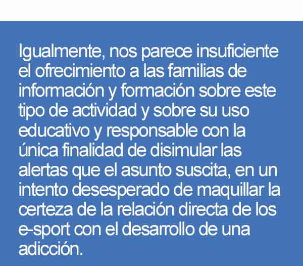 Igualmente, nos parece insuficiente el ofrecimiento a las familias de información y formación sobre este tipo de actividad y sobre su uso educativo y responsable con la única finalidad de disimular las alertas que el asunto suscita, en un intento desesperado de maquillar la certeza de la relación directa de los e-sport con el desarrollo de una adicción. Es como darte los ingredientes para enfermar y ofrecerte la cura en el mismo paquete.