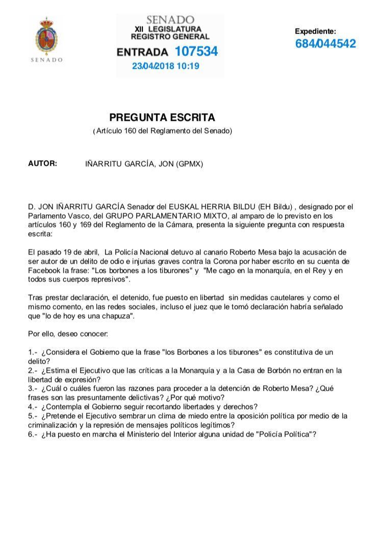 Jon Inarritu, de EH Bildu, registró esta mañana en el Senado una pregunta sobre la detención del activista canario Roberto Mesa. El senador Bildu resume brevemente en su exposición los hechos acontecidos: “el pasado 19 de abril, la Policía Nacional detuvo al canario Roberto Mesa bajo la acusación de ser autor de un delito de odio e injurias graves contra la Corona por haber escrito en su cuenta de Facebook la frase: “Los borbones a los tiburones” y “Me cago en la monarquía, en el Rey y en todos sus cuerpos represivos”.