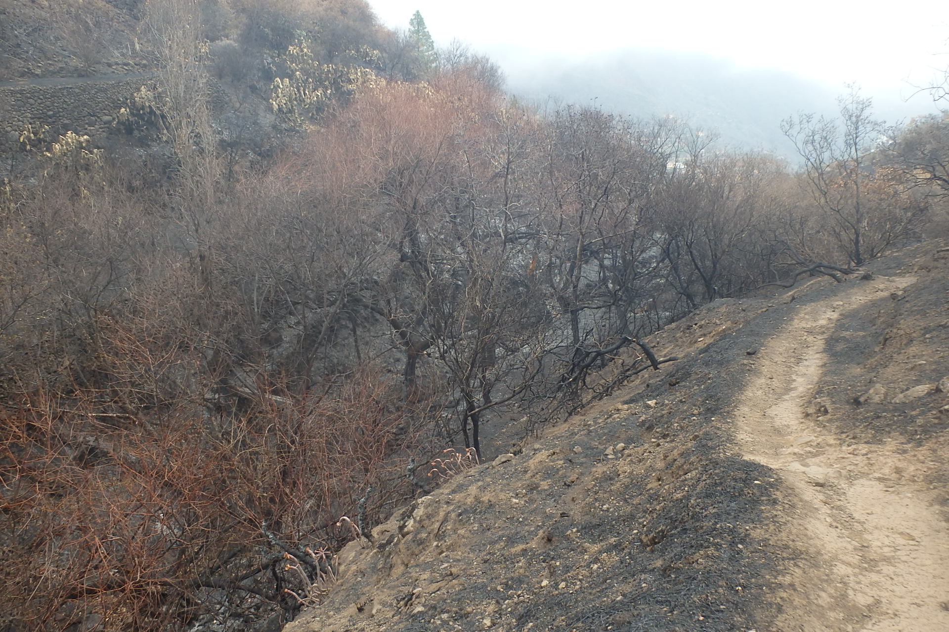 Integrantes de La Vinca Ecologistas en Acción y Turcón Ecologistas en Acción visitaron el Barranco de La Mina tras el devastador incendio que arrasó casi tres mil hectáreas de las cumbres de Gran Canaria el pasado mes de septiembre y que recientemente se ha dado por extinguido en su totalidad. El Barranco de La Mina es un espacio altamente sensible y tras habérsele sustraído prácticamente la totalidad del agua que antes circulaba por su cauce, se ha visto altamente afectado por los efectos del incendio forestal que según valoran los ecologistas “el 80% de la cabecera del mismo se ha visto arrasado por el fuego, habiéndose quemado completamente centenarios ejemplares de sauces canarios, mimbreras, álamos, nogales, almendreros, manzaneros, cirueleros, escobones… un auténtico destrozo de la flora, tanto endémica como productiva de la zona, y que seguro también ha afectado a la fauna del lugar, ya que el día de la visita prácticamente no se escuchaba en ningún momento el canto de las aves”.