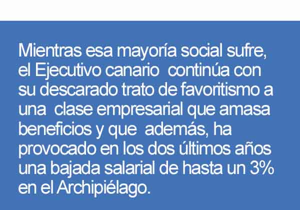 Por último, la satisfacción expresada por el Gobierno canario tras la firma de este acuerdo, la valora Intersindical Canaria como una nueva muestra de cinismo e hipocresía, ya que sobre los miembros del Ejecutivo, recae mayormente la responsabilidad de esta política de radical e injusto reparto de la riqueza que lleva a los trabajadores canarios a padecer los peores salarios, los indicadores en desempleo, trabajo precario y economía sumergida. Mientras esa mayoría social sufre, el Ejecutivo canario continúa con su descarado trato de favoritismo a una clase empresarial que amasa beneficios y que además, ha provocado en los dos últimos años una bajada salarial de hasta un 3% en el Archipiélago.
