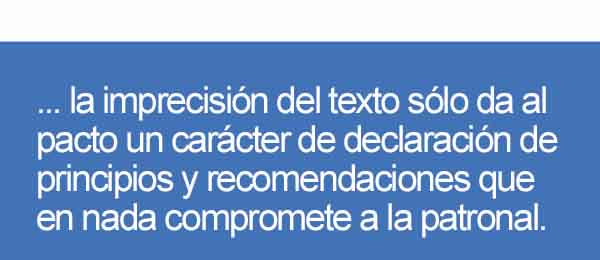 Lo mismo ocurre con el acuerdo sobre ultraactividad de los convenios y que estos conserven su vigencia durante los periodos de negociación y su prórroga automática en caso de desacuerdo. También este compromiso queda mediatizado cuando se dice que cada una de las partes podrá decidir que la negociación está agotada y, por tanto, instar a la mediación o el arbitraje. Además, el texto evita hacer mención a la inclusión de cláusulas de garantía salarial en los convenios sectoriales y de empresas.