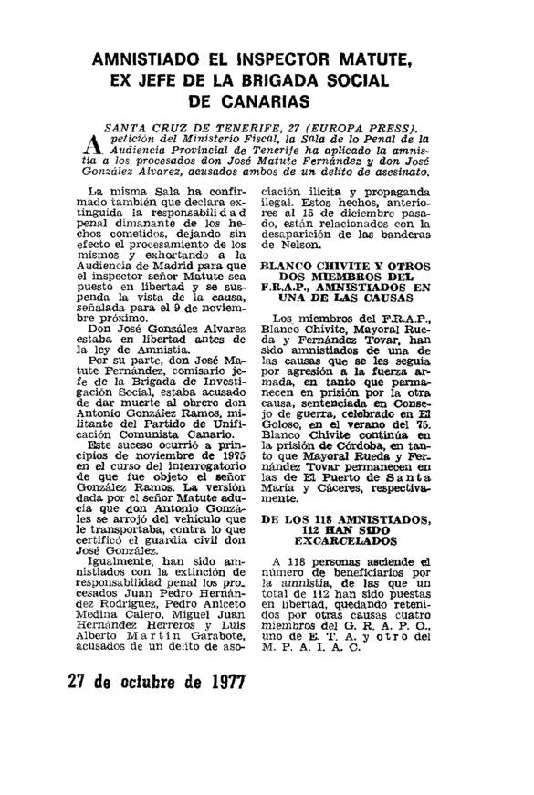 Los actores y la película de lo que pasó aquel 29 de octubre de 1975 tras el alevoso asesinato se apareció, nítida y vergonzosa, en mi recuerdo de aquella fecha: ¡Fuertes cabrones el Matute, el gobernador español Modesto Fraile Poujade, y toda la panda de criminales que intentaban tapar el asesinato diciendo que el desgraciado Antonio “se había tirado del coche en marcha intentando huir”! Fueron tan cabrones que, incluso, para dar verosimilitud a su versión y disfrazar el asesinato, montaron en un jeep al cadáver de Antonio y lo tiraron, en marcha a toda velocidad, a la carretera.