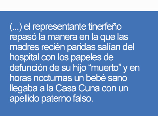 Junto a la representante de Gran Canaria, Begoña Ramos Vera, el representante tinerfeño repasó la manera en la que las madres recién paridas salían del hospital con los papeles de defunción de su hijo “muerto” y en horas nocturnas un bebé sano llegaba a la Casa Cuna con un apellido paterno falso.