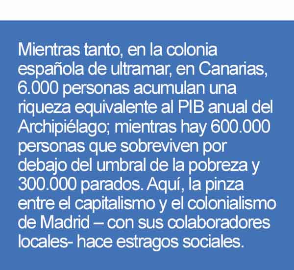 Mientras tanto, en la colonia española de ultramar, en Canarias, 6.000 personas acumulan una riqueza equivalente al PIB anual del Archipiélago; mientras hay 600.000 personas que sobreviven por debajo del umbral de la pobreza y 300.000 parados. Aquí, la pinza entre el capitalismo y el colonialismo de Madrid – con sus colaboradores locales- hace estragos sociales. De tal forma, si observamos otros datos veremos cómo: a pesar del descenso de la natalidad, en esta colonia española la densidad de población alcanza los 292 habitantes por km cuadrado, mientras en la metrópoli son solo 92 habitantes por km cuadrado; el salario medio es de 1.422 euros, mientras la media española es de 1.639. Tenemos también las pensiones más bajas, que alcanzan solo los 878 euros de media ante los 956 de media estatal.