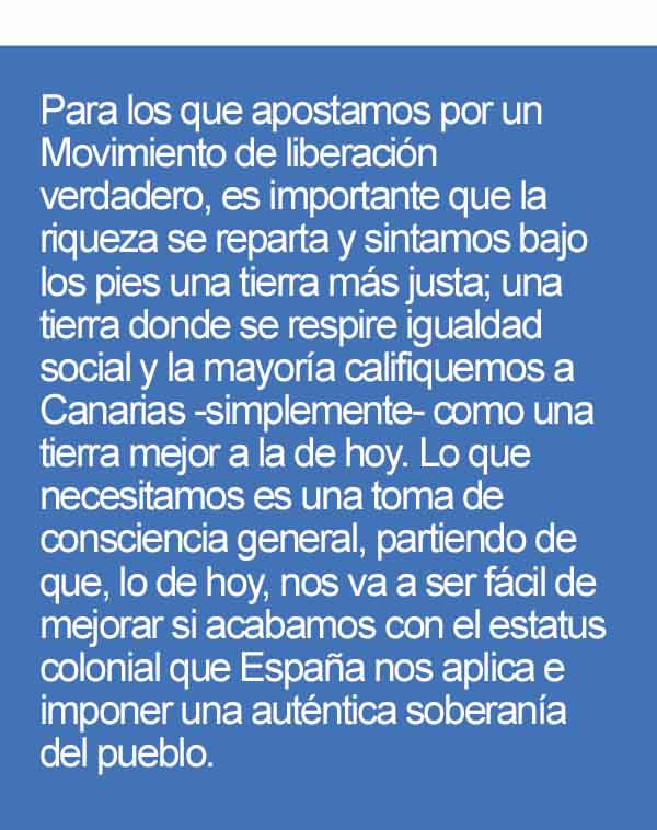 Personalmente, sé el futuro que quiero para mis paisanos y mi tierra; y, desde luego, no se trata de conseguir que vengan a vivir a Canarias cuatro ricos más o de hacer más ricos a los de siempre. Para los que apostamos por un Movimiento de liberación verdadero, es importante que la riqueza se reparta y sintamos bajo los pies una tierra más justa; una tierra donde se respire igualdad social y la mayoría califiquemos a Canarias -simplemente- como una tierra mejor a la de hoy. Lo que necesitamos es una toma de consciencia general, partiendo de que, lo de hoy, nos va a ser fácil de mejorar si acabamos con el estatus colonial que España nos aplica e imponer una auténtica soberanía del pueblo.
