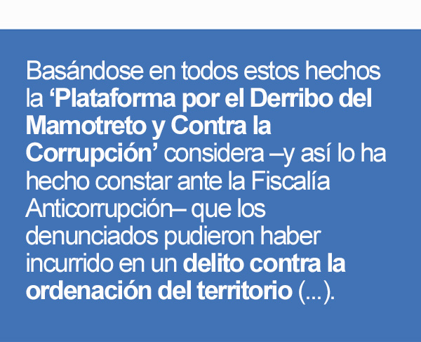 El pasado jueves 20 de abril, la ‘Plataforma por el Derribo del Mamotreto y contra la Corrupción’ presentó ante la Fiscalía Anticorrupción de Santa Cruz de Tenerife una denuncia por la presunta comisión de un delito contra la ordenación del territorio y otro de malversación de caudales públicos, concretados en la elaboración y aprobación provisional del Plan Especial del Frente de Playa de Las Teresitas.