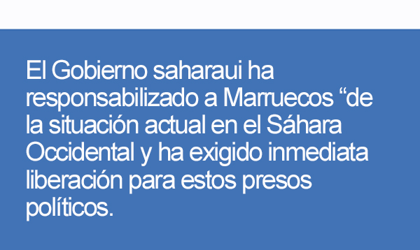 El Gobierno saharaui ha responsabilizado a Marruecos “de la situación actual en el Sáhara Occidental y ha exigido inmediata liberación para estos presos políticos. En este sentido el gobierno saharaui ha llamado a las organizaciones internacionales y las asociaciones de los Derechos Humanos para ejercer presión sobre el ocupante para la liberación de todos los presos políticos saharauis”, según informa la agencia de noticias saharaui.