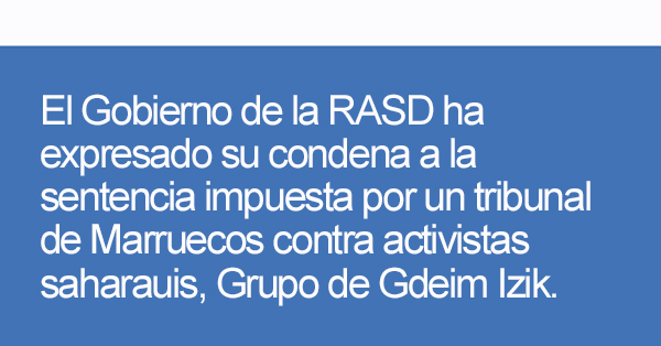 El Gobierno de la RASD ha expresado su condena a la sentencia impuesta por un tribunal de Marruecos contra activistas saharauis, Grupo de Gdeim Izik. La condena, impuesta por un tribunal marroquí de Salé, Rabat, capital de marruecos, ha sido de 291 años y cadena perpetua.
