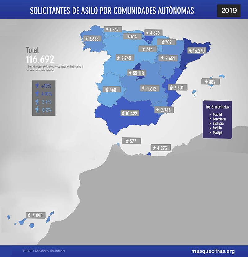 – Por Comunidades Autónomas, el número de solicitudes de asilo fue: Madrid 55.118, Catalunya 13.270, Andalucía 10.422, Comunidad Valenciana 7.501, Euskadi 4.826, Ciudad Autónoma de Melilla 4.273, Galicia 3.668, Canarias 3.095, Región de Murcia 2.748, Castilla y León 2.745, Aragón 2.651, Castilla La Mancha 1.612, Principado de Asturias 1.269, Islas Baleares 882, Navarra 709, Ciudad Autónoma de Ceuta 577, Cantabria 514, Extremadura 468, La Rioja 344.