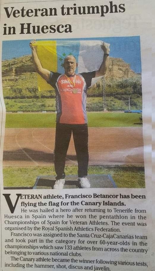 Acaba de cumplir setenta años y se siente con fuerzas para preparar un mundial de pentatlón de lanzamientos para atletas veteranos en 2024 (Goteborg). Se trata del sanandresino Francisco Santos Betancort Díaz (San Andrés, 1953). Para ello tendrá que lanzar jabalina, peso, disco, martillo y martillo pesado, artefactos que conoce perfectamente, y conseguir en cada uno una marca adecuada que le permita llegar en primer lugar al campeonato nacional. Eso sí, el peso de cada artefacto se adecúa en veteranos a la edad de cada cual.