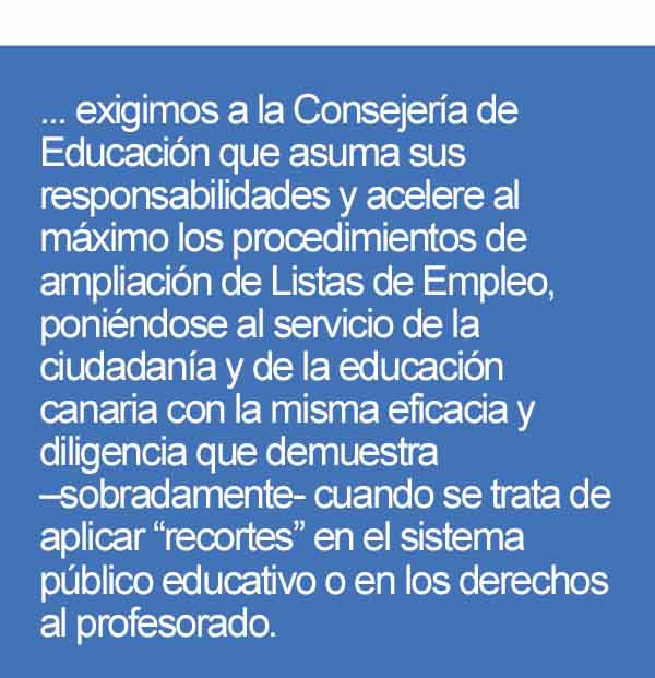 Desde el STEC-IC exigimos a la Consejería de Educación que asuma sus responsabilidades y acelere al máximo los procedimientos de ampliación de Listas de Empleo, poniéndose al servicio de la ciudadanía y de la educación canaria con la misma eficacia y diligencia que demuestra –sobradamente- cuando se trata de aplicar “recortes” en el sistema público educativo o en los derechos al profesorado.