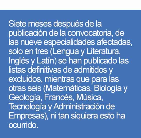 Por otro lado, resulta evidente que si la Administración continúa con su tónica de desidia y desprecio hacia los miles de compañeros/as que se inscribieron en dicha ampliación de listas de empleo, mucho nos tememos que las más recientes convocatorias extraordinarias de ampliación realizadas para siete especialidades del cuerpo de maestros/as (mes de julio) y ocho de Escuelas de Arte (mes de agosto), correrán la misma suerte.