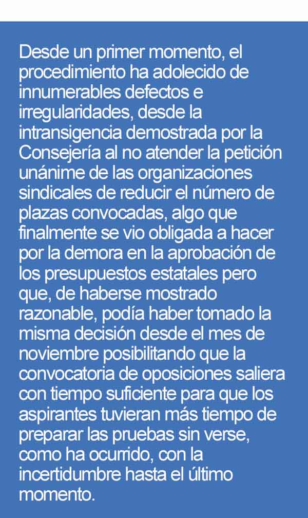 Pero los problemas no se quedan sólo en la descomunal cifra de personas excluidas. Desde un primer momento, el procedimiento ha adolecido de innumerables defectos e irregularidades, desde la intransigencia demostrada por la Consejería al no atender la petición unánime de las organizaciones sindicales de reducir el número de plazas convocadas, algo que finalmente se vio obligada a hacer por la demora en la aprobación de los presupuestos estatales pero que, de haberse mostrado razonable, podía haber tomado la misma decisión desde el mes de noviembre posibilitando que la convocatoria de oposiciones saliera con tiempo suficiente para que los aspirantes tuvieran más tiempo de preparar las pruebas sin verse, como ha ocurrido, con la incertidumbre hasta el último momento. Además, para la publicación de la convocatoria, la Consejería no tuvo en cuenta las aportaciones que desde el STEC-IC y otras organizaciones sindicales le trasladamos, dándose la aberrante circunstancia de que se nos hizo llegar el documento, de 212 páginas, media hora antes de la reunión en la que se iba a tratar.