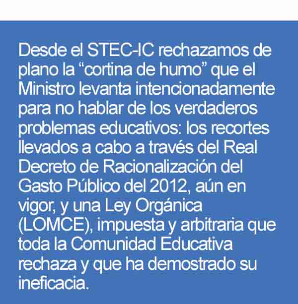 Desde el STEC-IC rechazamos de plano la “cortina de humo” que el Ministro levanta intencionadamente para no hablar de los verdaderos problemas educativos: los recortes llevados a cabo a través del Real Decreto de Racionalización del Gasto Público del 2012, aún en vigor, y una Ley Orgánica (LOMCE), impuesta y arbitraria que toda la Comunidad Educativa rechaza y que ha demostrado su ineficacia.