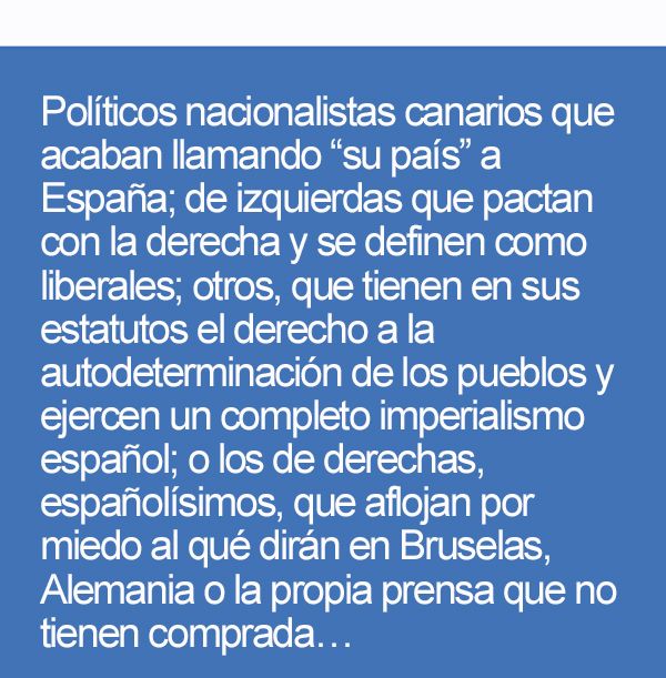 Políticos nacionalistas canarios que acaban llamando “su país” a España; de izquierdas que pactan con la derecha y se definen como liberales; otros, que tienen en sus estatutos el derecho a la autodeterminación de los pueblos y ejercen un completo imperialismo español; o los de derechas, españolísimos, que aflojan por miedo al qué dirán en Bruselas, Alemania o la propia prensa que no tienen comprada… Así es el espectro político de la democracia monárquica de la España actual, donde queda muy poca o ninguna dignidad.