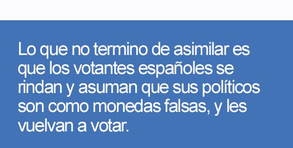 Lo que no termino de asimilar es que los votantes españoles se rindan y asuman que sus políticos son como monedas falsas, y les vuelvan a votar. Esos votantes, ni siquiera se preguntan cuántos políticos corruptos (demostradamente corruptos) han llegado al poder gracias a su voto. Tampoco que muchos de ellos se llevaron gran parte de su sueldo a paraísos fiscales, para no aportar a las arcas públicas; desde donde se pagan las pensiones, la sanidad, la investigación de enfermedades o las ayudas para comer de las personas en peor situación. Tampoco sienten culpa por aquellos acusados de maltrato o violencia doméstica del partido que votaron. Cuestiones ante las que incumplir un programa o tener debilidad ideológica pasan a un segundo plano en una sociedad de analfabetos políticos, más influenciados por los programas del corazón y telerealidad que por debates políticos. Claro que, en esos debates políticos, las ideologías y programas quedarán opacados por las acusaciones de corrupción que se lanzarán los propios protagonistas.