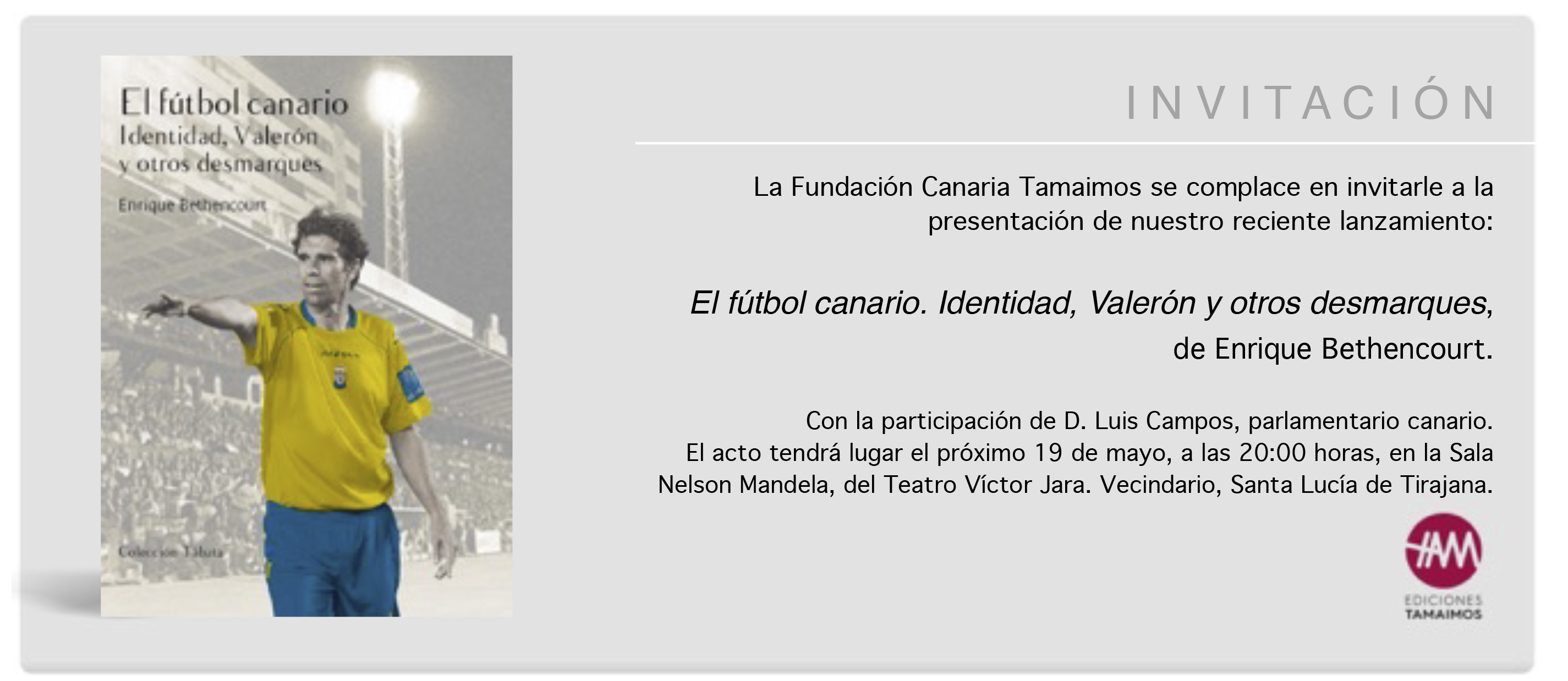 Gran Canaria, 12 de mayo de 2017 – La sexta publicación de Ediciones Tamaimos se titula “El fútbol canario. Identidad, Valerón y otros desmarques”. Se trata de un tríptico futbolístico firmado por Enrique Bethencourt, en el que diserta sobre el estilo futbolístico propiamente canario. El texto incluye tres prólogos a cada una de las partes, firmados por del ex entrenador de la Unión Deportiva Las Palmas y el Club Deportivo Tenerife, Ángel Cappa, el periodista deportivo y columnista de The Guardian, Sid Lowe y el escritor y periodista canario, Santiago Gil.