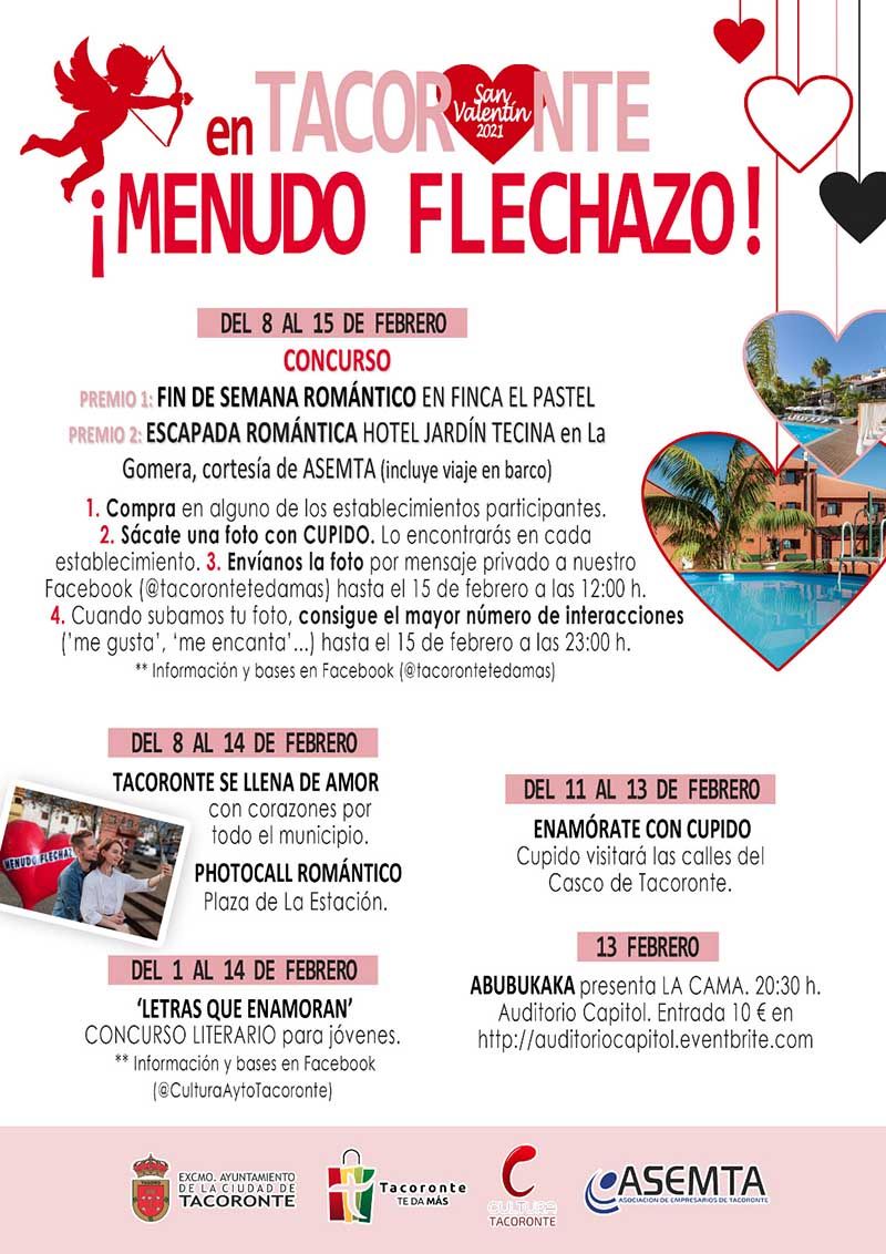 El Ayuntamiento de Tacoronte, a través de la Concejalía de Comercio del municipio ha organizado una campaña comercial con motivo del día de San Valentín abierta a la participación de cualquier empresa del municipio. Bajo el slogan: ‘En Tacoronte, ¡menudo flechazo!’; se apuesta por la dinamización a la par que se fomenta el consumo.