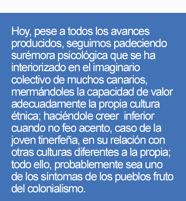 La conducta manifestada por la joven tinerfeña, reitero, es expresión de la situación sociológica degenerativa del pueblo canario; la responsabilidad de tal situación de anidamiento y crecimiento de la decadencia acelerada respecto de las señas de identidad del pueblo canario; decadencia producida, ya sea por el desinterés o, peor aún, intencionalidad auspiciada, presuntamente, desde los diferentes órganos de poderes insularistas, salvo honrosas excepciones, que, por tal confirman la regla. En Canarias existe, incuestionablemente, desde la misma conquista, gran parte de los sectores de la burguesía isleña havenido valorando lo que venía de afuera, pues se suponía era mejor que lo endógeno, una elite que ha dejado su complejo de provincianismo emulador cortesano, el cual arraigaría en el ideario isleño. Hoy, pese a todos los avances producidos, seguimos padeciendo surémora psicológica que se ha interiorizado en el imaginario colectivo de muchos canarios, mermándoles la capacidad de valor adecuadamente la propia cultura étnica; haciéndole creer inferior cuando no feo acento, caso de la joven tinerfeña, en su relación con otras culturas diferentes a la propia; todo ello, probablemente sea uno de los síntomas de los pueblos fruto del colonialismo.