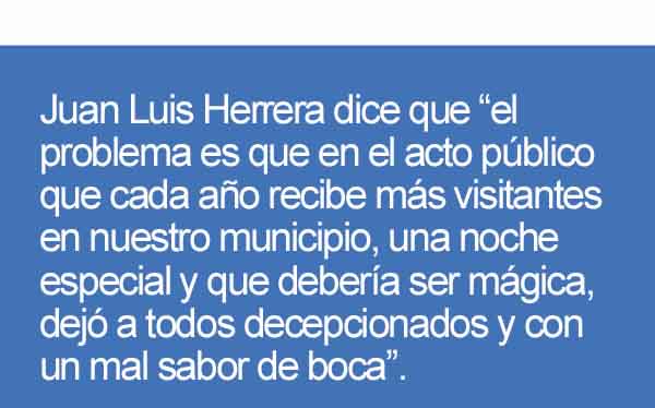 Juan Luis Herrera dice que “el problema es que en el acto público que cada año recibe más visitantes en nuestro municipio, una noche especial y que debería ser mágica, dejó a todos decepcionados y con un mal sabor de boca”. Además, el edil recuerda “el aluvión de críticas inundó las redes sociales y la imagen de La Laguna quedó por los suelos en uno de los días señalados del año”.