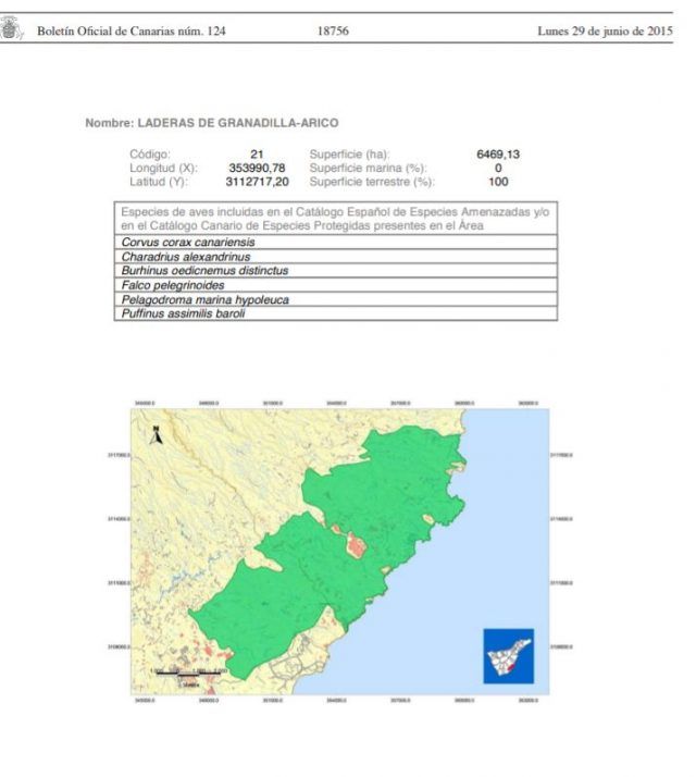 Cabe señalar que la parcela en la que finalmente tuvo lugar la competición, según nos consta, estaría catalogada como Suelo Rústico de Protección Natural y quedaría dentro de una zona declarada como Prioritaria de Reproducción, Alimentación, Dispersión y Concentración de Especies Amenazadas de Avifauna de Canarias. Hasta seis especies de aves catalogadas como amenazadas y/o protegidas, están presentes en el área. Estas figuras jurídicas de protección del suelo, se mostrarían a todas luces incompatibles con una actividad que presenta un impacto tan notorio sobre el medio natural, como lo son los Campeonatos de Recorridos de Caza, durante los que se llegan a efectuar miles de disparos de perdigones sobre otros tantos miles de platos hechos añicos en el aire.
