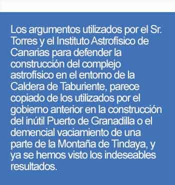 Los argumentos utilizados por el Sr. Torres y el Instituto Astrofísico de Canarias para defender la construcción del complejo astrofísico en el entorno de la Caldera de Taburiente, parece copiado de los utilizados por el gobierno anterior en la construcción del inútil Puerto de Granadilla o el demencial vaciamiento de una parte de la Montaña de Tindaya, y ya se hemos visto los indeseables resultados.