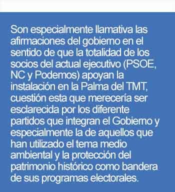 Son especialmente llamativa las afirmaciones del gobierno en el sentido de que la totalidad de los socios del actual ejecutivo (PSOE, NC y Podemos) apoyan la instalación en la Palma del TMT, cuestión esta que merecería ser esclarecida por los diferente partidos que integran el Gobierno y especialmente la de aquellos que han utilizado el tema medio ambiental y la protección del patrimonio histórico como bandera de sus programas electorales.
