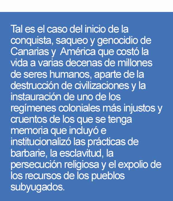 En Canarias, es especialmente ofensivo que los representantes de la ilícita y decadente Corona española, pretendan que se festeje el mentado 12 de octubre porque debemos recordar que el genocidio de los pueblos americanos, tuvo precisamente en el archipiélago canario su principal campo de ensayo. Basta recordar que la sangrienta conquista de Canarias, desarrollada entre 1402 y 1496, tuvo el similar modelo de devastación, ataque frontal hacia las culturas aborígenes, la persecución y castigo a las creencias religiosas y que tras ser iniciadas y practicadas en Canarias tuvieron su prolongación y fueron exportadas al denominado “nuevo mundo” a partir de 1492.