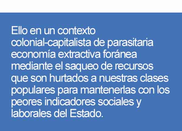 No existe, por tanto, motivo alguno para festejar la hispanidad, menos aún siendo esta una tierra que ha continuado sufriendo los efectos del sistema colonial español con una deliberada política de desarraigo y expatriación forzada, luego con el denominado Tributo de sangre, y la secular y despreciable segregación en el acceso a los derechos sociales y cívicos. Ello en un contexto colonial-capitalista de parasitaria economía extractiva foránea mediante el saqueo de recursos que son hurtados a nuestras clases populares para mantenerlas con los peores indicadores sociales y laborales del Estado.