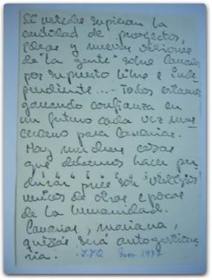 Rememoró una publicación en “La Opinión” de Daniel Millet y Octavio Hernández en que rebatían la reiterada opinión interesada de un Javier apolítico, muerto sin causa, sino por la pura casualidad de encontrarse con una bala volante que pasaba por allí. Buscó la foto y el recorte que mostraba el reverso de puño y letra del propio Javier, y lo leyó para sí mismo, emocionado, en alta voz: “Si ustedes supieran la cantidad de proyectos, ideas y nuevas visiones de “la gente” sobre Canarias por supuesto libre e independiente…Todos estamos ganando confianza en un futuro cada vez más cercano para Canarias. Hay muchas cosas que debemos hacer perdurar pues son vestigios únicos de otras épocas de la humanidad. Canarias mañana, quizás, será autogestionaria”