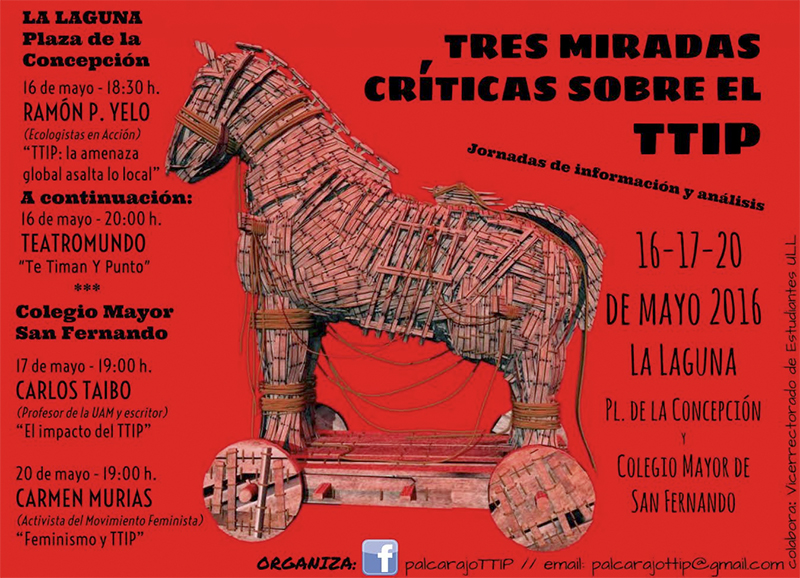 Se contará con la presencia de Ramón P. Yelo de Ecologistas en Acción, quien estará el lunes 16 en la Plaza de la Concepción, a partir de las 18h30m con la charla «TTIP: la amenaza global asalta lo local». A continuación el grupo «Teatromundo» representará la pieza teatral «TTIP. Te Timan y Punto», una obra pensada para explicar de modo ameno algunas de las características clave y las consecuencias que tendrá el TTIP para quienes viven en Canarias.