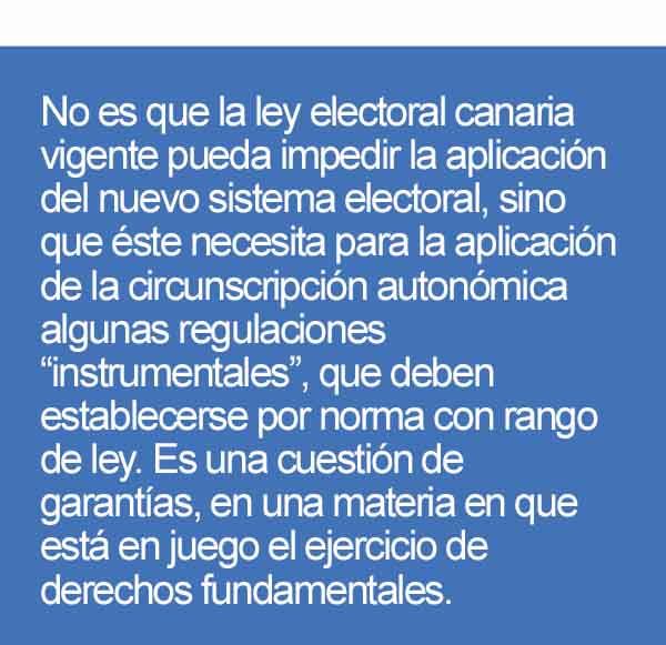 No es que la ley electoral canaria vigente pueda impedir la aplicación del nuevo sistema electoral, sino que éste necesita para la aplicación de la circunscripción autonómica algunas regulaciones “instrumentales”, que deben establecerse por norma con rango de ley. Es una cuestión de garantías, en una materia en que está en juego el ejercicio de derechos fundamentales.