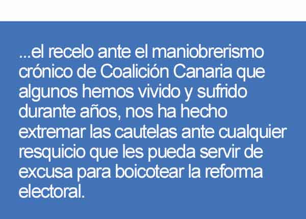 Sin embargo, el recelo ante el maniobrerismo crónico de Coalición Canaria que algunos hemos vivido y sufrido durante años, nos ha hecho extremar las cautelas ante cualquier resquicio que les pueda servir de excusa para boicotear la reforma electoral. Y cuestionarnos la aplicabilidad directa de la nueva regulación estatutaria en el caso de que Coalición Canaria intentara y consiguiera bloquear las iniciativas legislativas para completar   el “nuevo” sistema electoral. En ese caso: ¿es aplicable directamente?