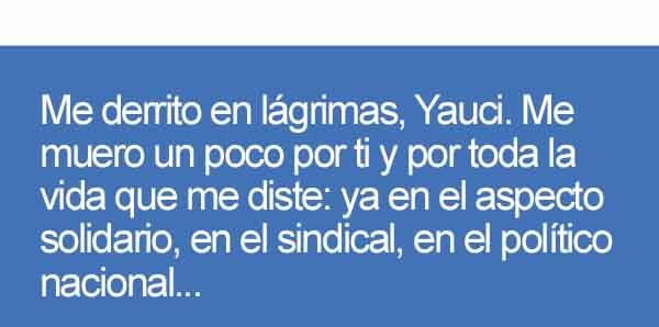 Me derrito en lágrimas, Yauci. Me muero un poco por ti y por toda la vida que me diste: ya en el aspecto solidario, en el sindical, en el político nacional, o en el trazado de tu coche donde, yo, firmemente agarrado, regresaba al fuego amigo de la noche beñesmal para entregar nuestra presa al grupo, y con las cenizas liberar un poquito más la patria.