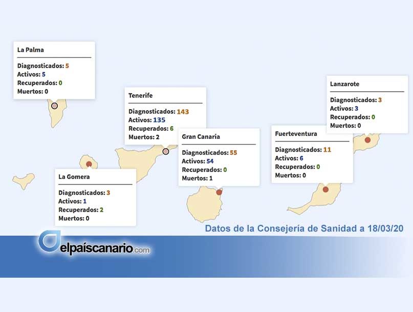Por islas Tenerife cuenta con 143 casos acumulados; Gran Canaria, 55; La Gomera, 3; La Palma, 5; Lanzarote, 3 y Fuerteventura, 11.