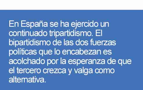 En España se ha ejercido un continuado tripartidismo. El bipartidismo de las dos fuerzas políticas que lo encabezan es acolchado por la esperanza de que el tercero crezca y valga como alternativa. Pero el miedo al cambio auténtico se inyecta diariamente en los medios de comunicación y en el discurso de unos acomodados políticos que pueden ser de cualquier partido español indiferentemente.