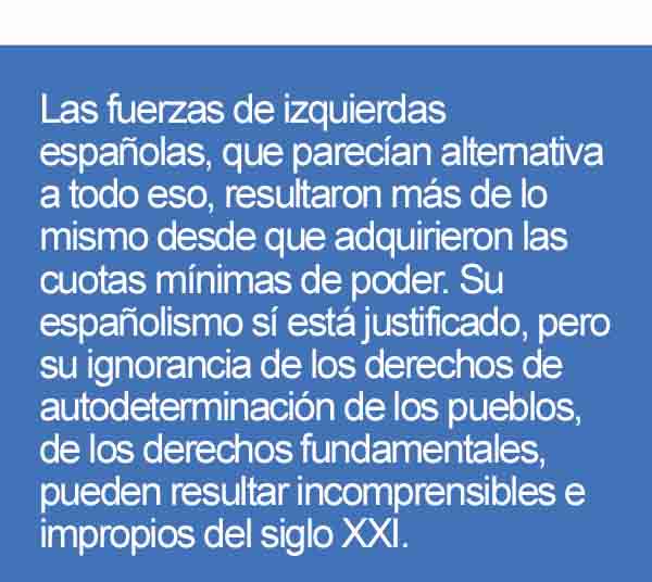Se llega a tal punto que, los voceros políticos, viven en una nube confortable desde la que riegan de analfabetismo y mentiras todo lo que hay por debajo. Las fuerzas de izquierdas españolas, que parecían alternativa a todo eso, resultaron más de lo mismo desde que adquirieron las cuotas mínimas de poder. Su españolismo sí está justificado, pero su ignorancia de los derechos de autodeterminación de los pueblos, de los derechos fundamentales, pueden resultar incomprensibles e impropios del siglo XXI. Pero es que toda Europa camina en el mismo sentido.