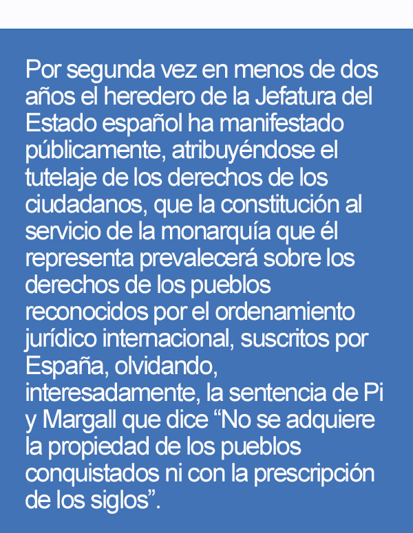 Por segunda vez en menos de dos años el heredero de la Jefatura del Estado español ha manifestado públicamente, atribuyéndose el tutelaje de los derechos de los ciudadanos, que la constitución al servicio de la monarquía que él representa prevalecerá sobre los derechos de los pueblos reconocidos por el ordenamiento jurídico internacional, suscritos por España, olvidando, interesadamente, la sentencia de Pi y Margall que dice “No se adquiere la propiedad de los pueblos conquistados ni con la prescripción de los siglos”.